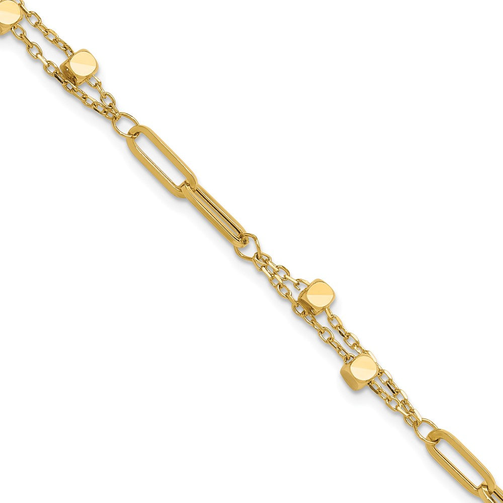 14K Polished Square Beads and Paperclip Link 7 inch Bracelet Plus 0.5 inch Extender