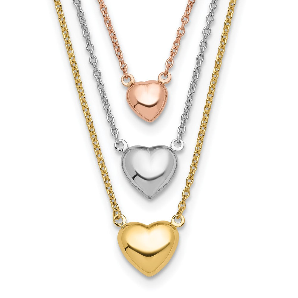 14K Tri-color Three Hearts 16 inch Layered Necklace Plus 1 inch Extender