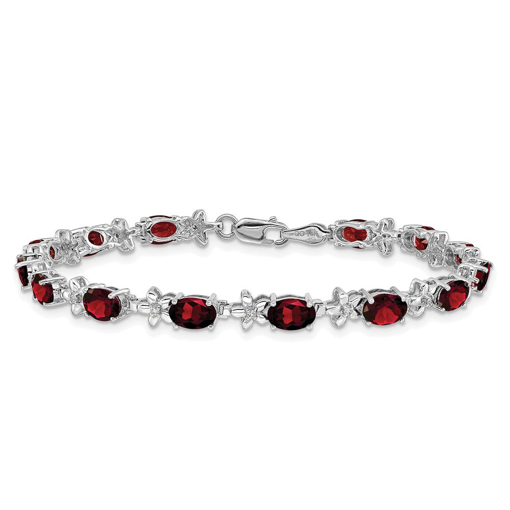14k White Gold Complete Diamond and Oval Garnet Floral 7 inch Bracelet