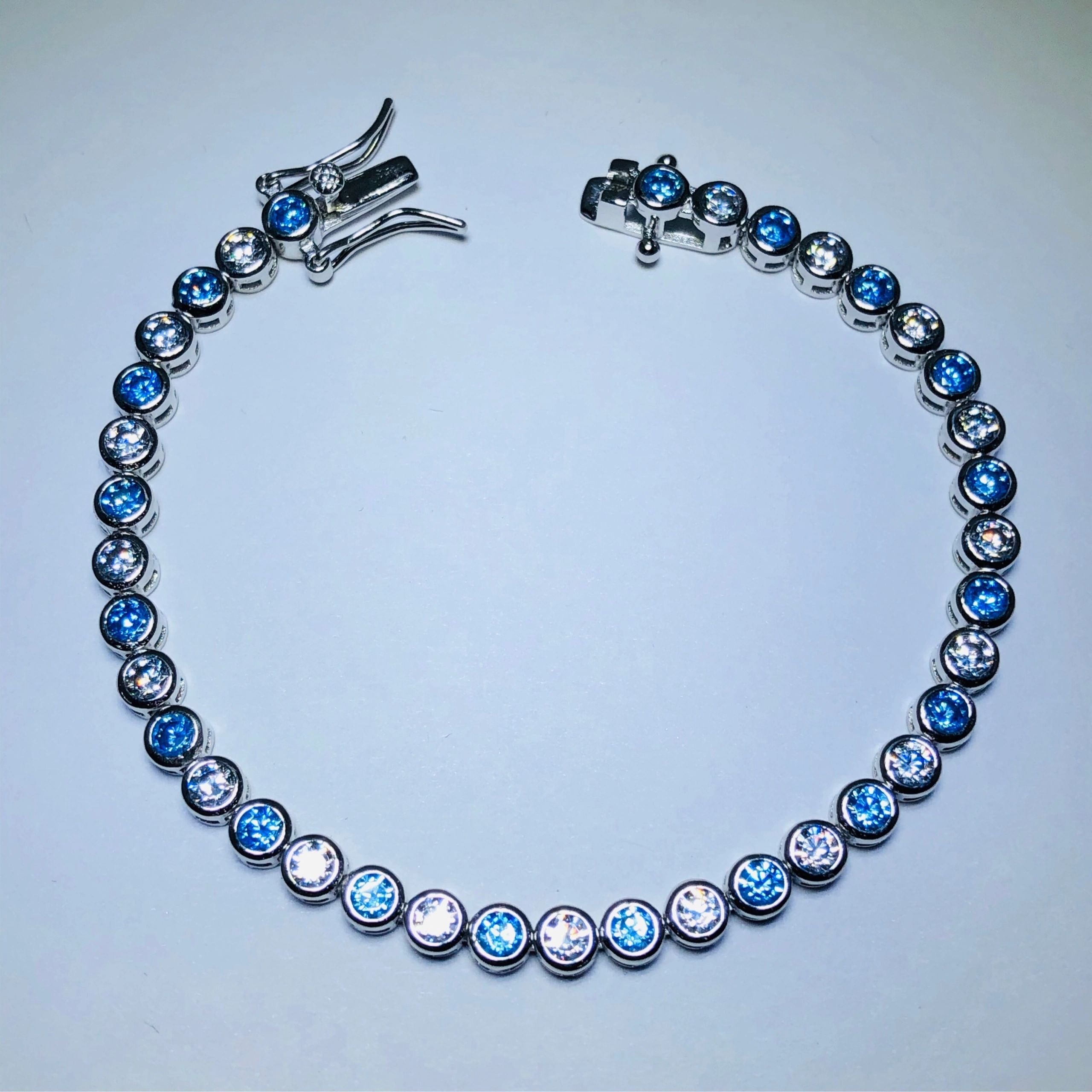 Platinum over sterling silver blue & white sapphire bezel tennis bracelet 6” length