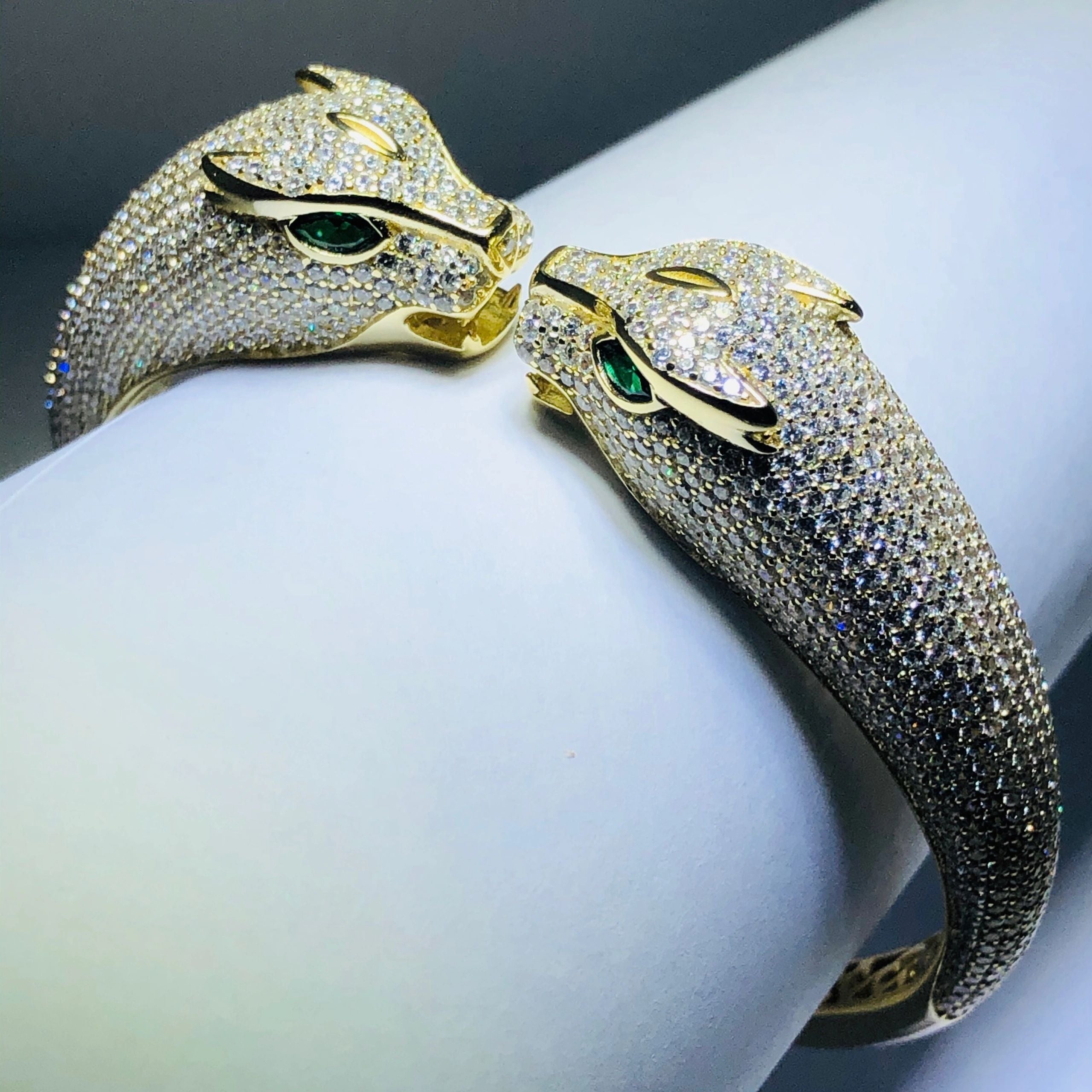 18k yellow gold over sterling silver micro pave white sapphire panther cuff bangle bracelet