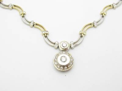 Elevate your style with the LIV 14k Solid Two Tone Gold Tennis Necklace. Featuring a unique halo design and genuine white diamonds, this piece adds a touch of elegance to any outfit. Dress up your look with this playful, yet sophisticated, accessory.