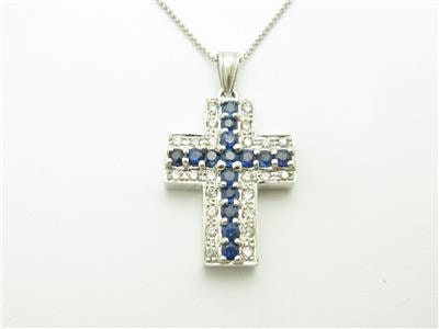 This LIV necklace is a timeless treasure, made with 14k solid white gold and adorned with genuine diamonds and blue sapphires. Its vintage design and cross pendant add a touch of elegance to any outfit. Perfect for those seeking a classic piece with a modern twist.