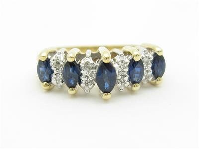 Indulge in luxury with the LIV 14k Solid Yellow Gold Genuine Blue Sapphire & Diamond Marquee Design Band Ring. Made with quality craftsmanship, this ring showcases a unique marquee design with genuine blue sapphires and shimmering diamonds. Make a stylish statement with this one-of-a-kind piece.