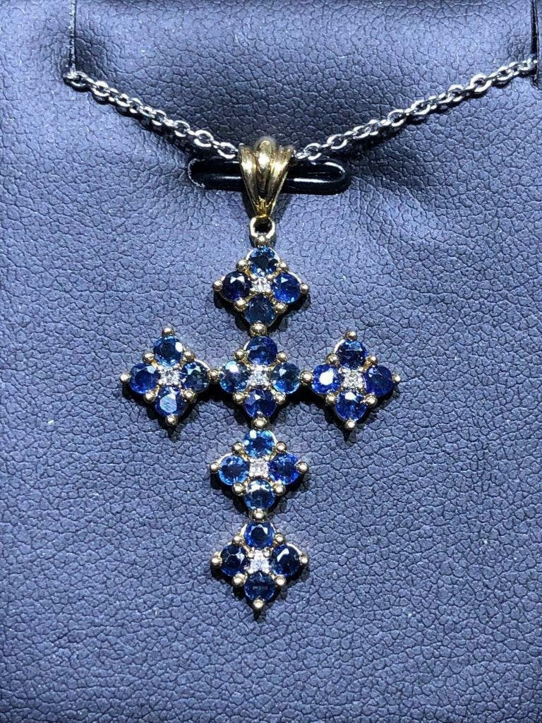 Add some divine bling to your outfit with this gorgeous LIV cross pendant. Handcrafted with 14k solid yellow gold, it features lustrous white diamonds and mesmerizing blue sapphires. Elevate your style and showcase your faith with this unique and stunning piece.