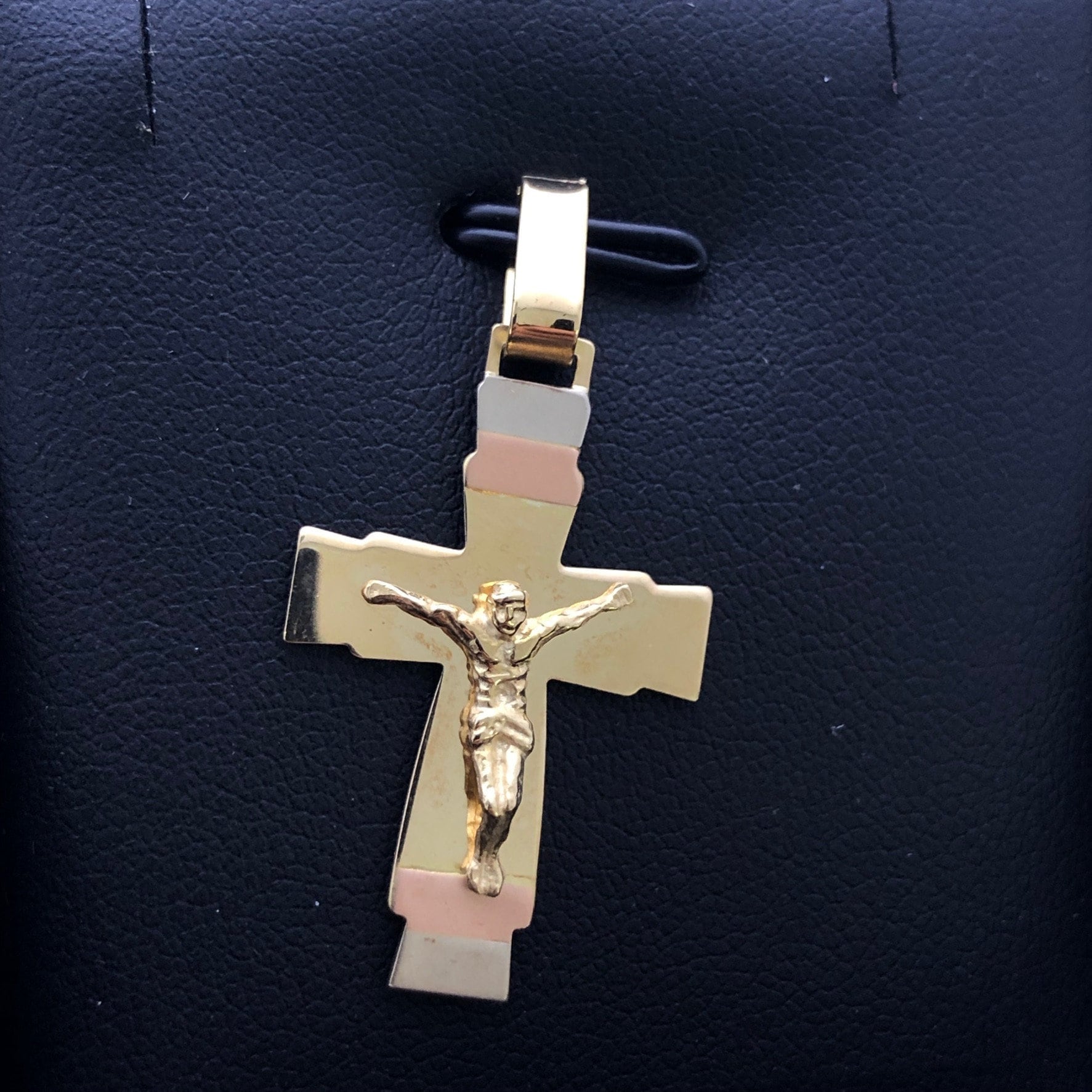 Elevate your style with this LIV 14k Tri Color Gold Crucifix Jesus Cross Design One of a Kind Charm Pendant. Showcasing a unique and playful design, this pendant adds a touch of quirk and fun to any outfit. Perfect for anyone who wants to stand out and express their individuality.