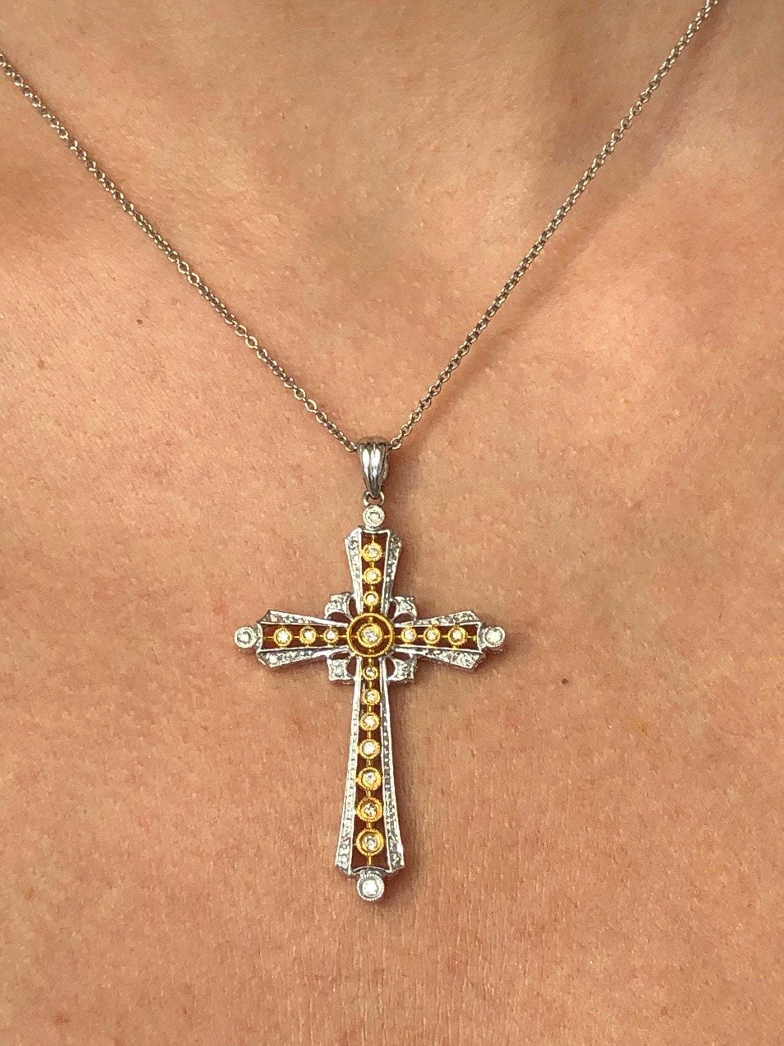 Add a touch of boldness and glamour to your wardrobe with the LIV 14k Two Tone Gold & Diamonds Necklace. Featuring a stunning pave-set cross design, this necklace is a statement piece that exudes elegance and sophistication. Upgrade your look and be the envy of others with this unique and playful accessory.