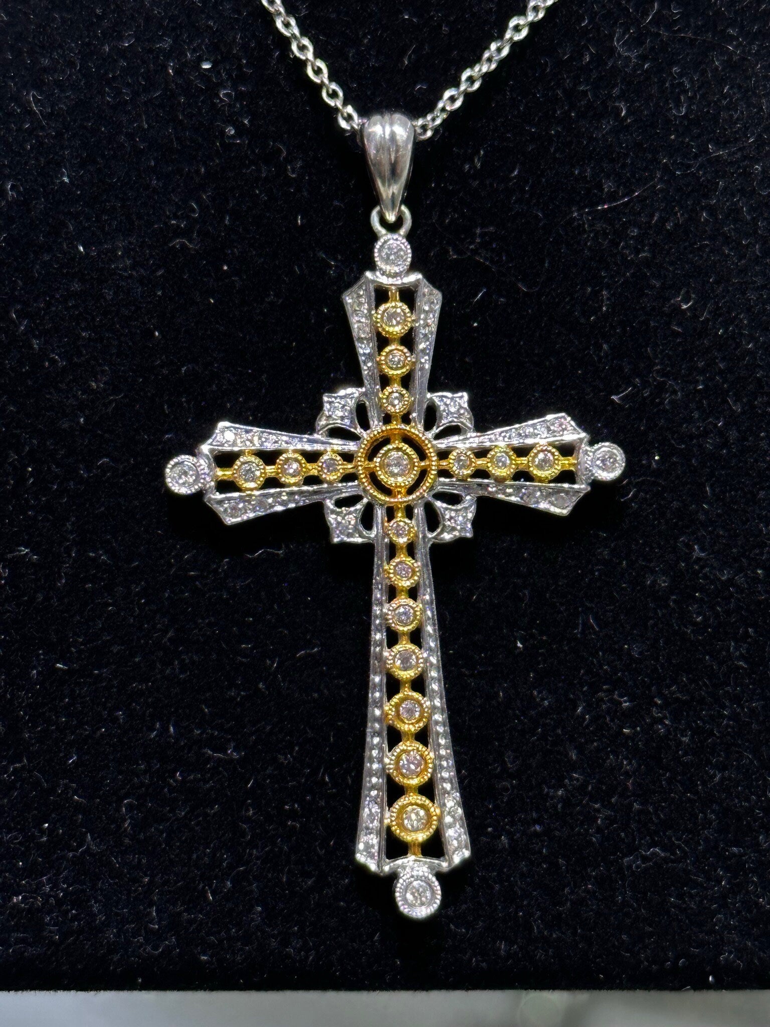 Add some heavenly style to your wardrobe with the LIV 14k Two Tone Gold Natural White Diamonds Pave Set Large Cross Crucifix Pendant. Made from quality materials, this pendant features a unique two-tone design and sparkling diamonds for a touch of divine elegance. Perfect for everyday wear or special occasions.