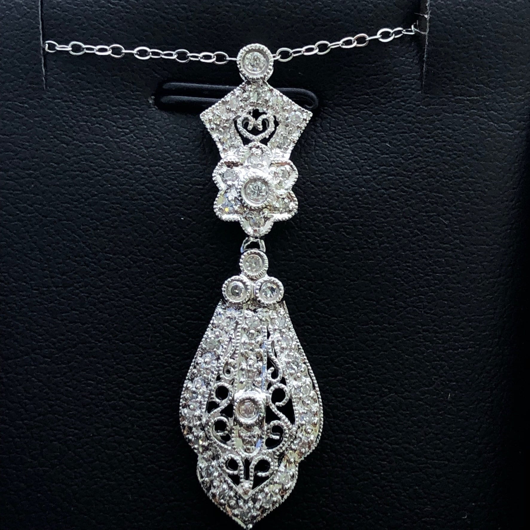 LIV 14k White Gold & Diamonds G/VS1 Round Cut Vintage Design Long Pendant Necklace