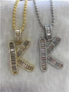 THIS IS TRULY A MUST HAVE DESIGNER 18K YELLOW GOLD STERLING SILVER BAGUETTE WHITE SAPPHIRE LARGE INITIAL K DESIGN NECKLACE FOR ALL OCCASIONS. MADE WITH 18K YELLOW GOLD OVER SILVER .925. GET THE DESIGNER LOOK WITHOUT THE EXPENSIVE PRICE TAG! THIS NECKLACE WOULD BE A COMPLIMENT FOR ANYONE'S JEWELRY COLLECTION. ALL STONES ARE HAND SET CRAETED WHITE SAPPHIRES FOR THE REAL DIAMOND LOOK & SPARKLE! PLEASE VIEW OUR LISTINGS FOR SOME OTHER UNIQUE ITEMS. COMES WITH A BEAUTIFUL JEWELRY BOX FREE!!