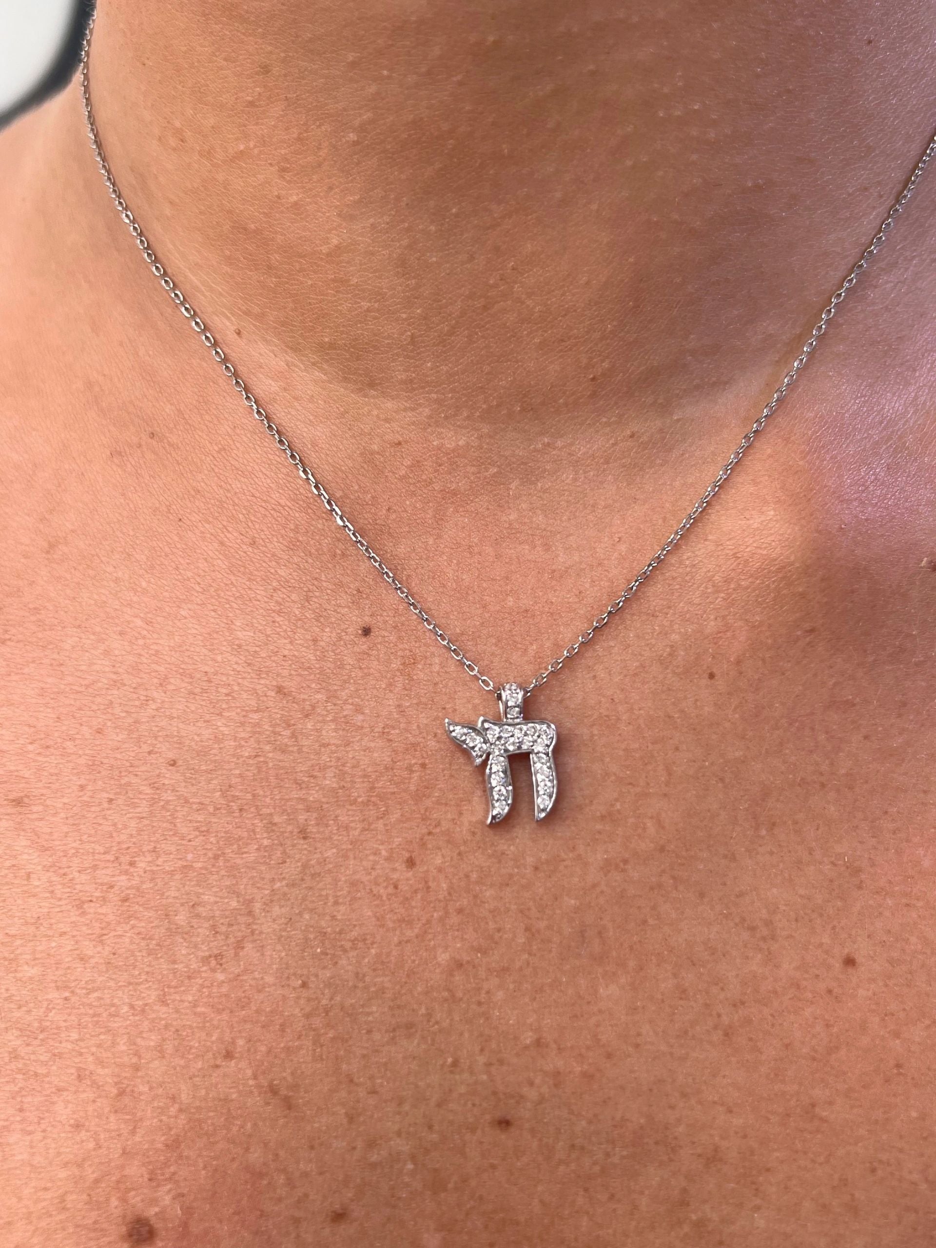 LIV "Chai" 14K White Gold and Diamond Pendant Necklace Add some sparkle to any outfit with this chic "Chai" pendant necklace! Made with 14K white gold and featuring stunning diamond accents, it's a must-have for any jewelry collection. You'll be sure to turn heads and receive compliments when you wear this unique necklace (and maybe even a few envious glances)!