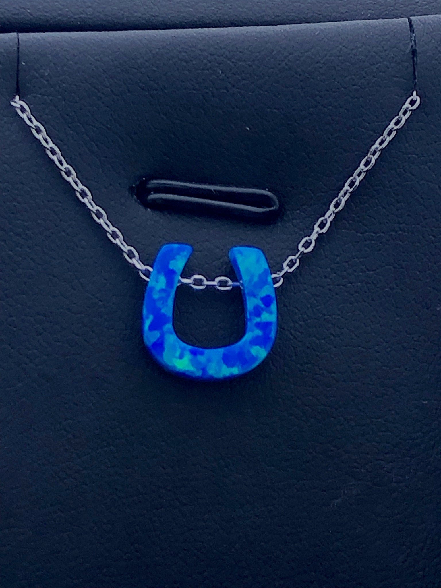 LIV Platinum Sterling Silver .925 Blue Opal Horseshoe Good Luck Stackable Necklace