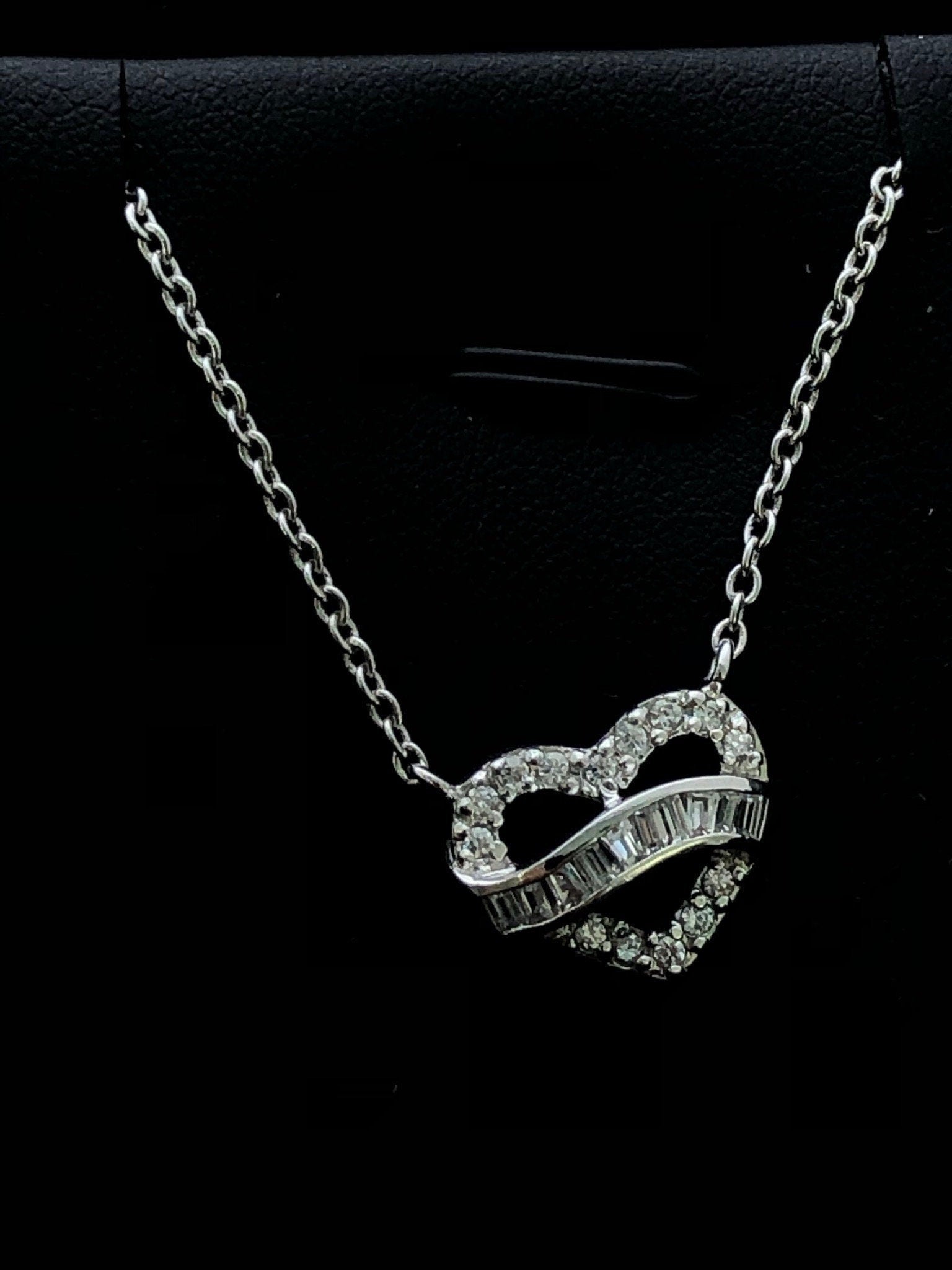 LIV Platinum Sterling Silver .925 White Sapphire Baguette Heart Halo Design Necklace