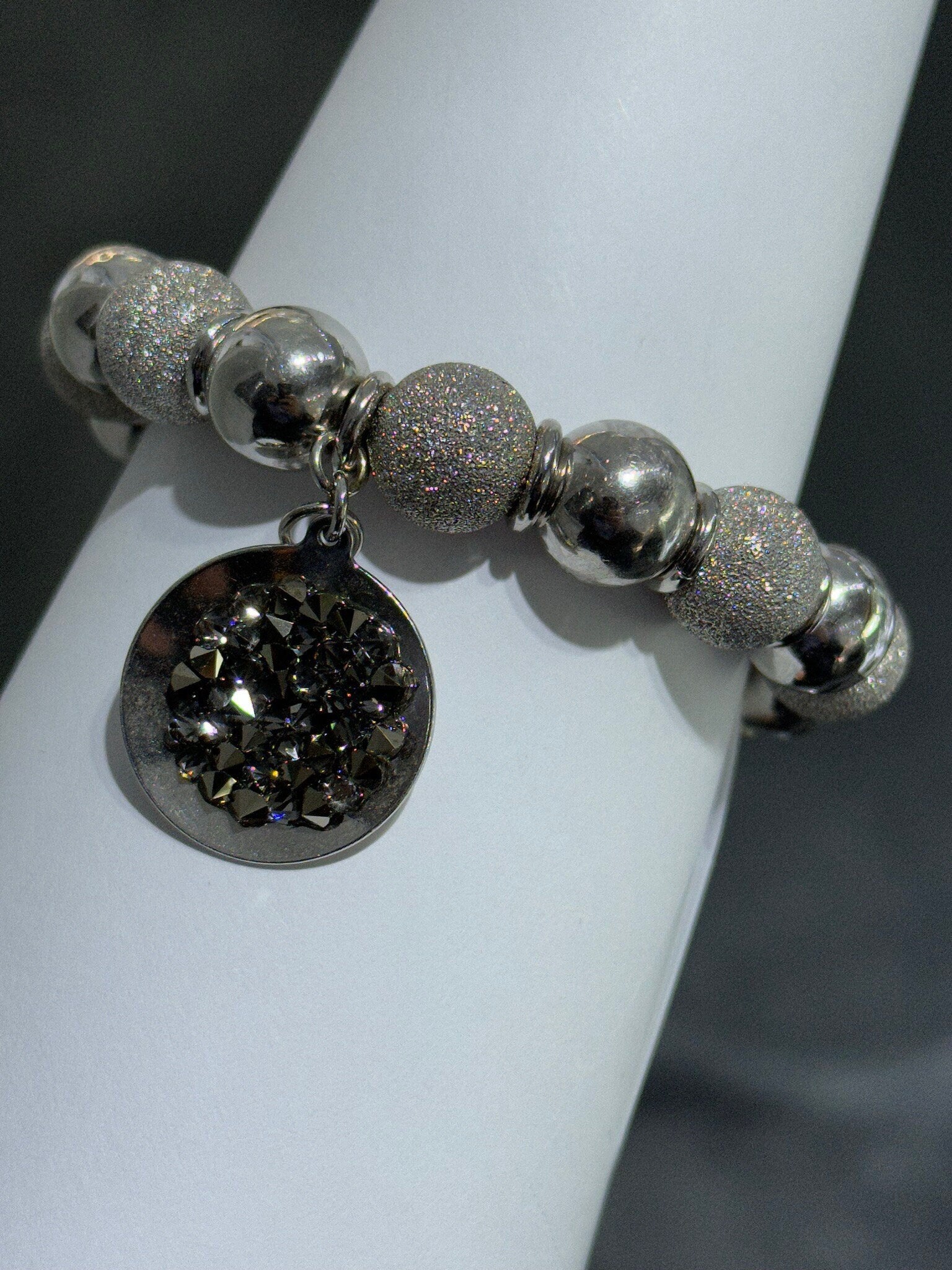 LIV Platinum Sterling Silver Diamond Cut Bead Design Stretch Halo Hand Made Tennis Dangle Stack Bracelet Gift