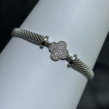 LIV Platinum Sterling Silver Pave White Sapphire Clover Halo Hand Made Mesh Lobster Lock Bracelet Gift