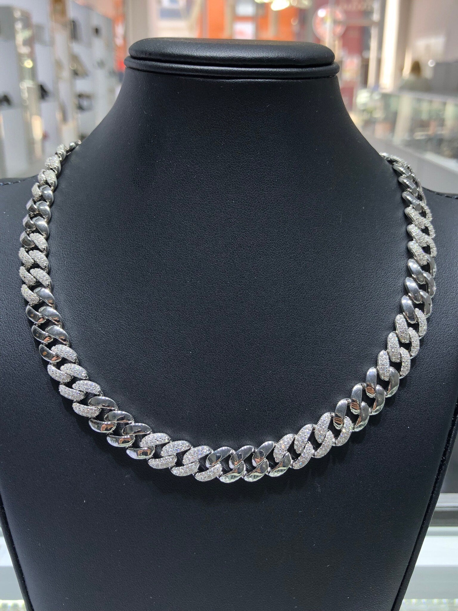 LIV Platinum Sterling Silver Pave White Sapphire Cuban Link Wide Alternating Stone Links Tennis Necklace 16" L
