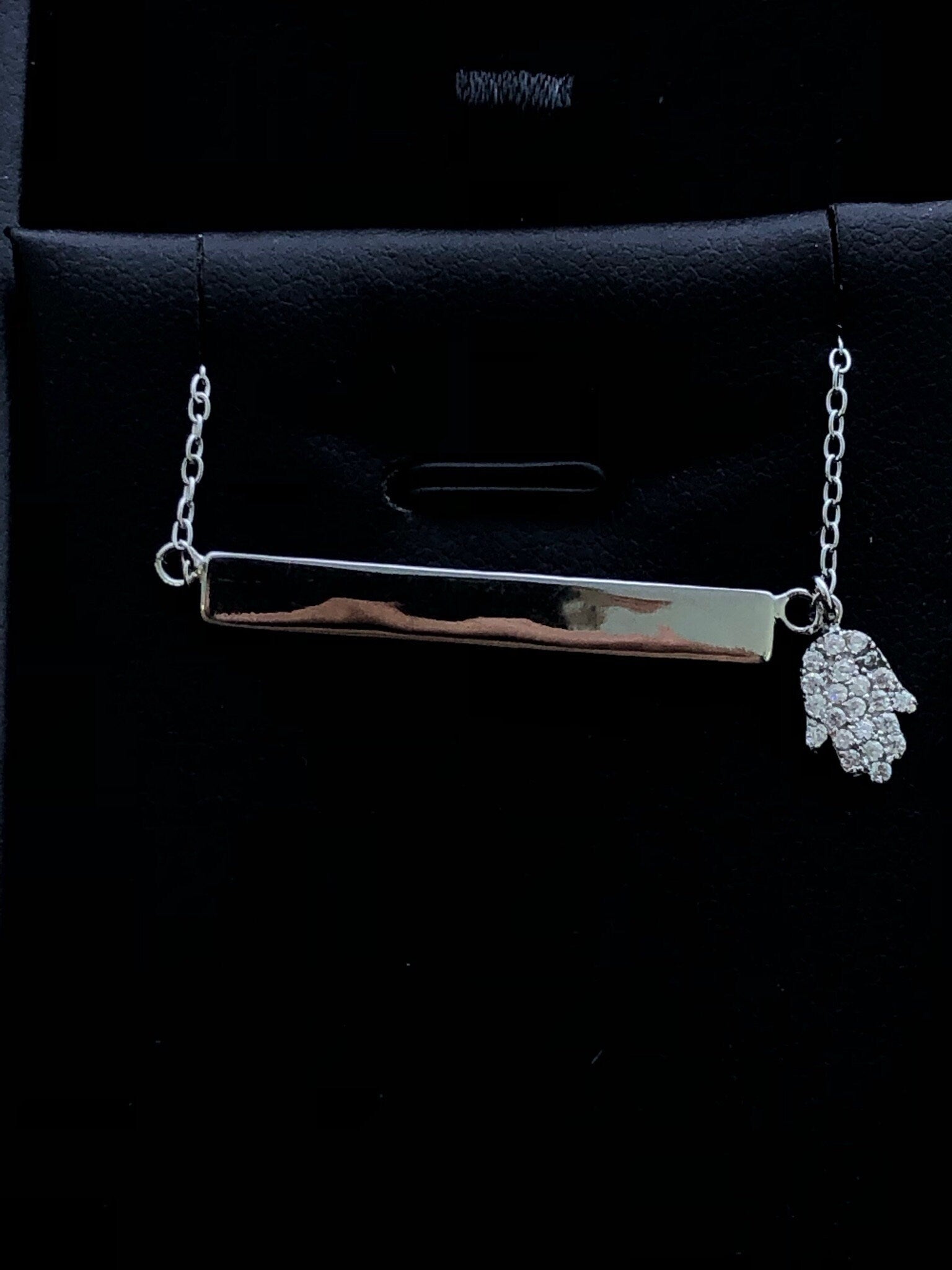 LIV Platinum Sterling Silver White Sapphire Pave Hamsa Bar Design Necklace Gift