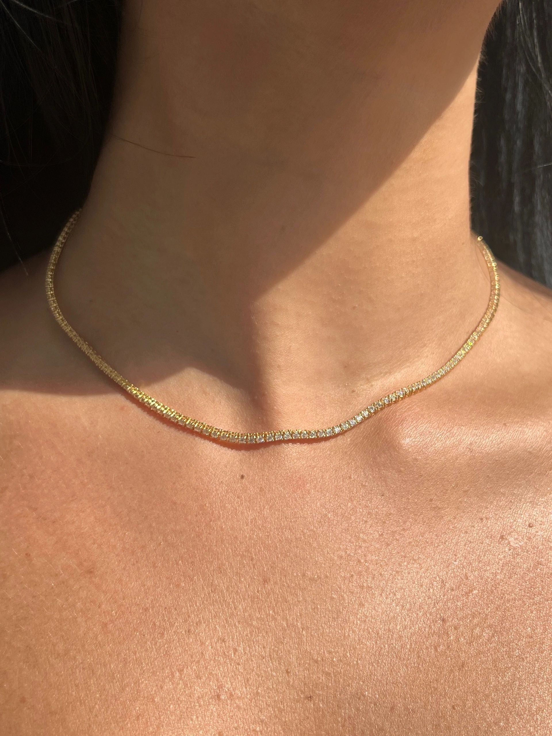 Get ready to shine with the LIV "Shine" Yellow Gold Diamond Tennis Necklace. This blingy, eye-catching accessory is designed to make you stand out, whether you're hitting the town or just making a statement in the office. It's the perfect way to add some sparkle to your everyday look, so go ahead and treat yourself to some luxurious shine!