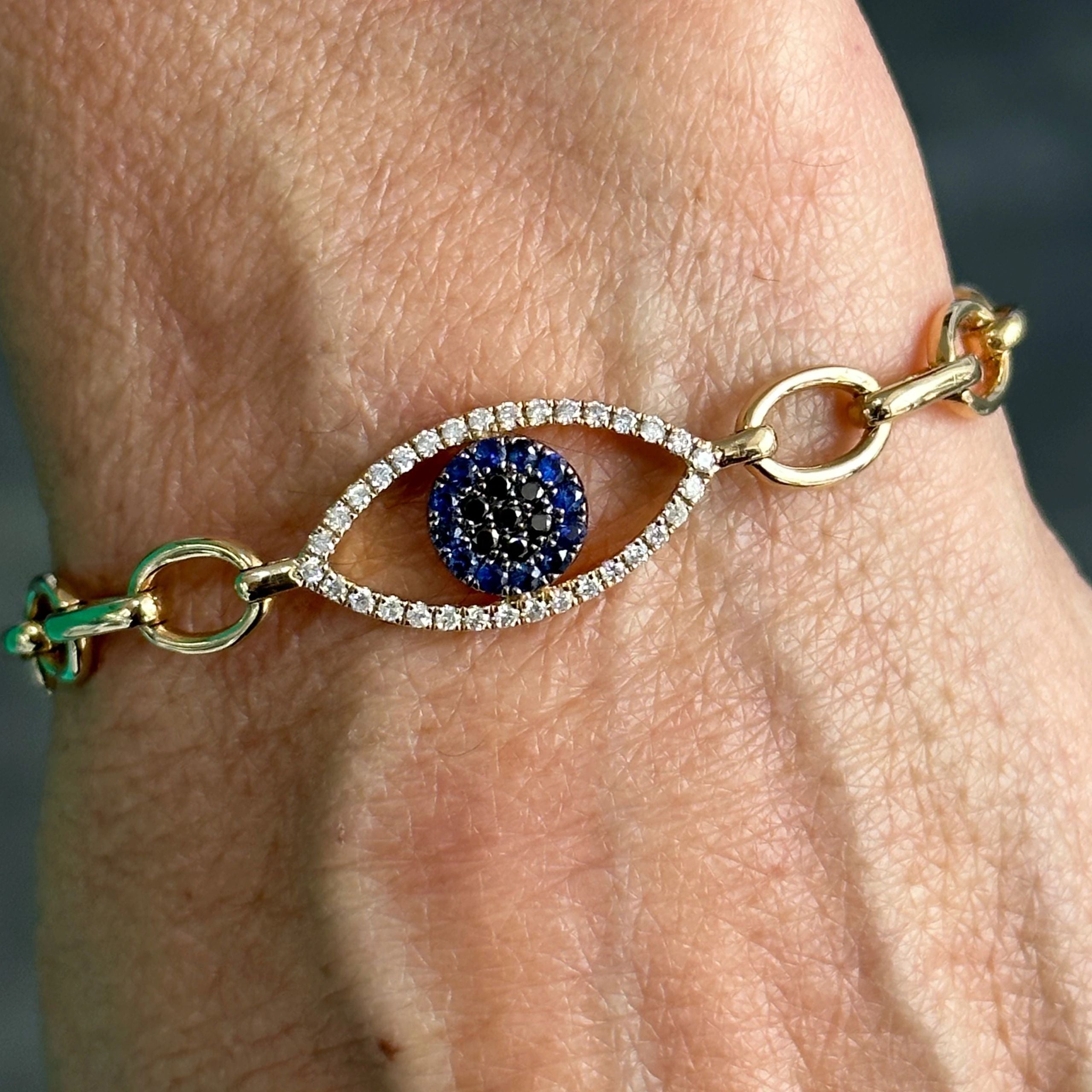 Step up your accessory game with the LIV "Sophia" Evil Eye Bracelet! This chic and stylish bracelet is crafted from 14kt yellow gold and features stunning natural diamonds and blue sapphires for a touch of sparkle. At 7" in length, this bracelet is the perfect size to add to your wrist stack or wear on its own for a subtle but eye-catching statement. Protect yourself from negative energy and look fabulous while doing it with the LIV "Sophia" Evil Eye Bracelet!