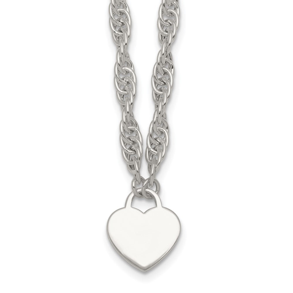 Sterling Silver Polished Fancy Engravable Heart Disc on Rope Chain 16 Inch with 2 Inch Extension Necklace