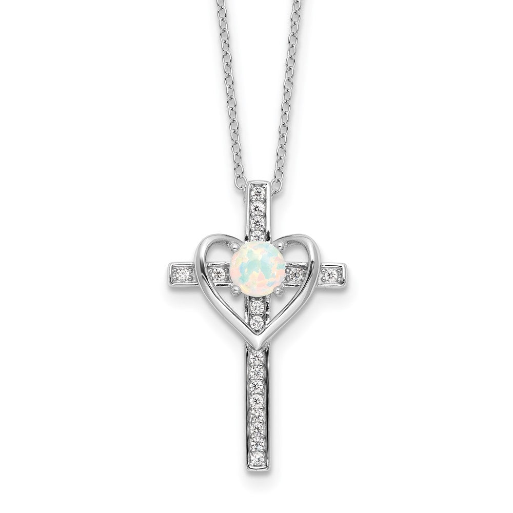 Sterling Silver RH-plated Created Opal and CZ Cross w/Heart 18in Necklace