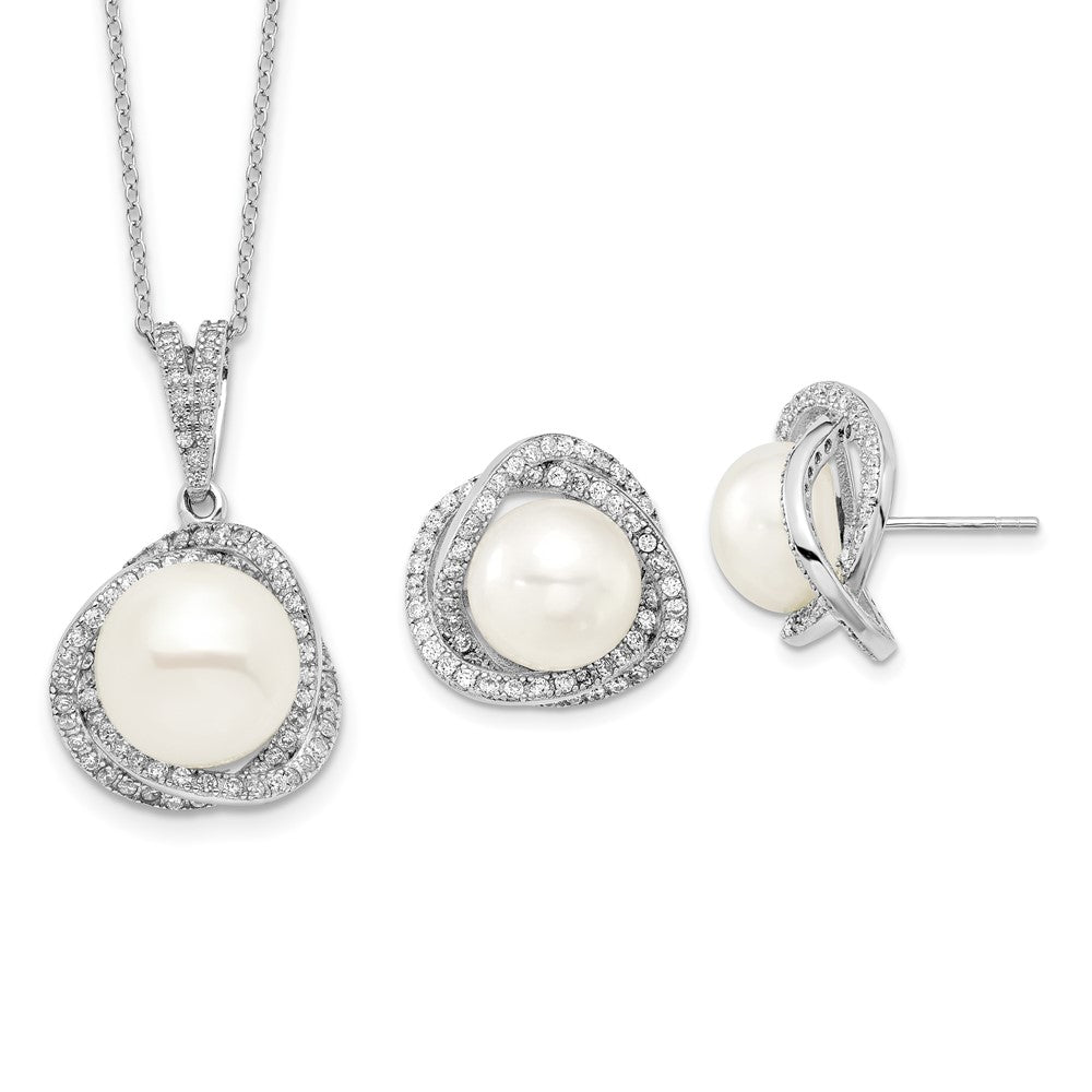 Sterling Silver Rhodium-plated 10-12mm White Button Freshwater Cultured Pearl and CZ 17 inch Necklace and Post Earrings Set