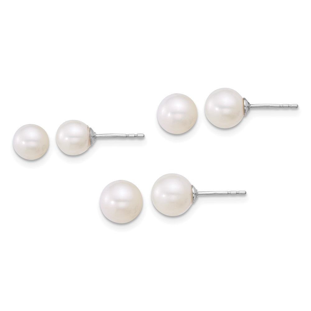 Sterling Silver Rhodium-plated 5-6mm/6-7mm/7-8mm Round White Freshwater Cultured Pearl Post Earring Set