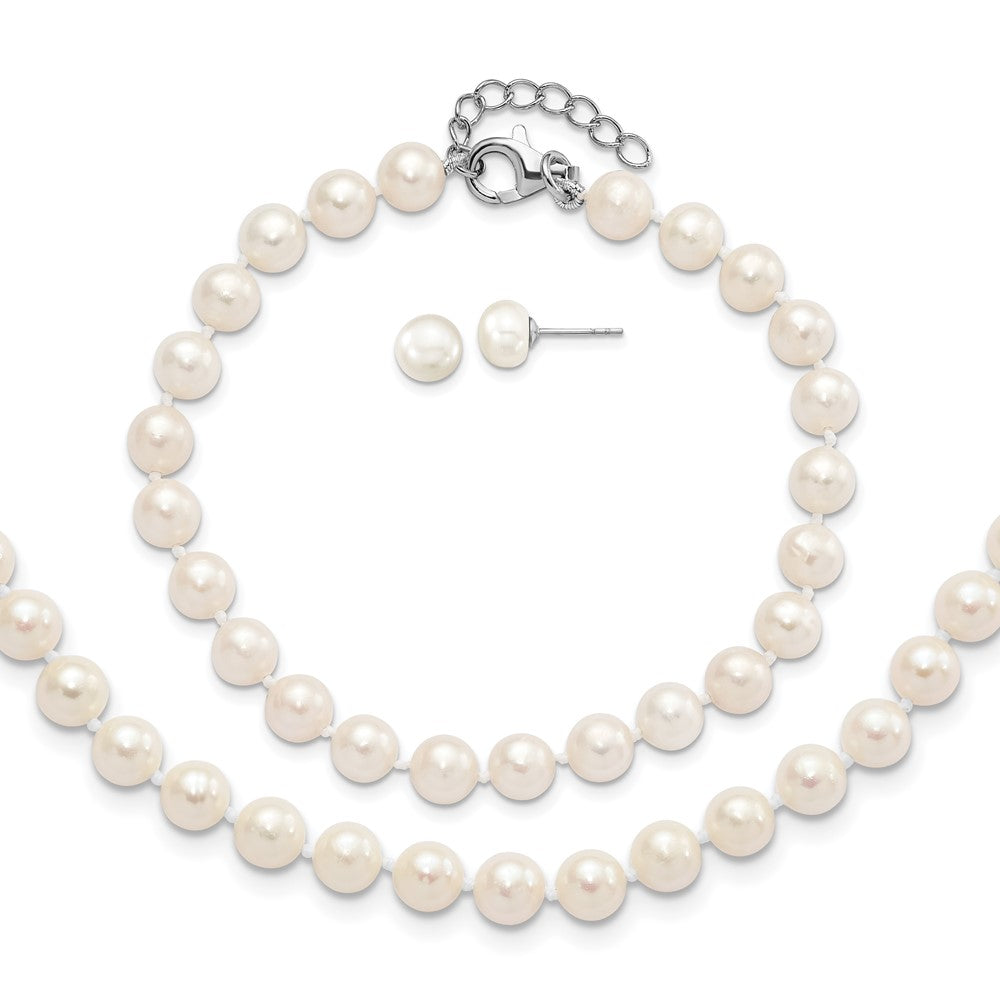 Sterling Silver Rhodium-plated 6-7mm White Semi-Round Freshwater Cultured Pearl 18 inch with 2 inch Extension Necklace, 7 inch Bracelet and Button Post Earrings Set