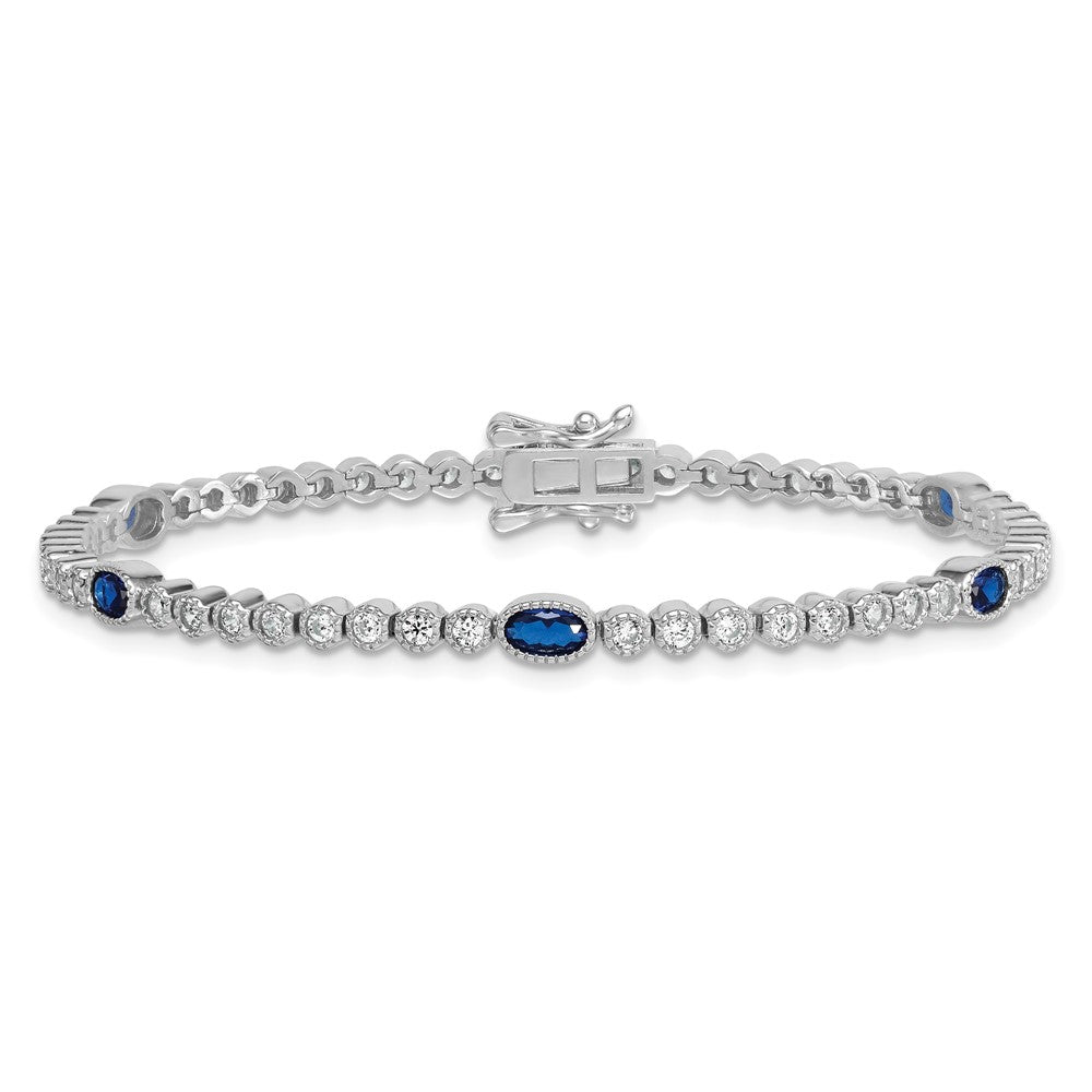 Sterling Silver Rhodium-plated Polished and Beaded Fancy Oval Blue and Round White CZ 7 Inch Bracelet