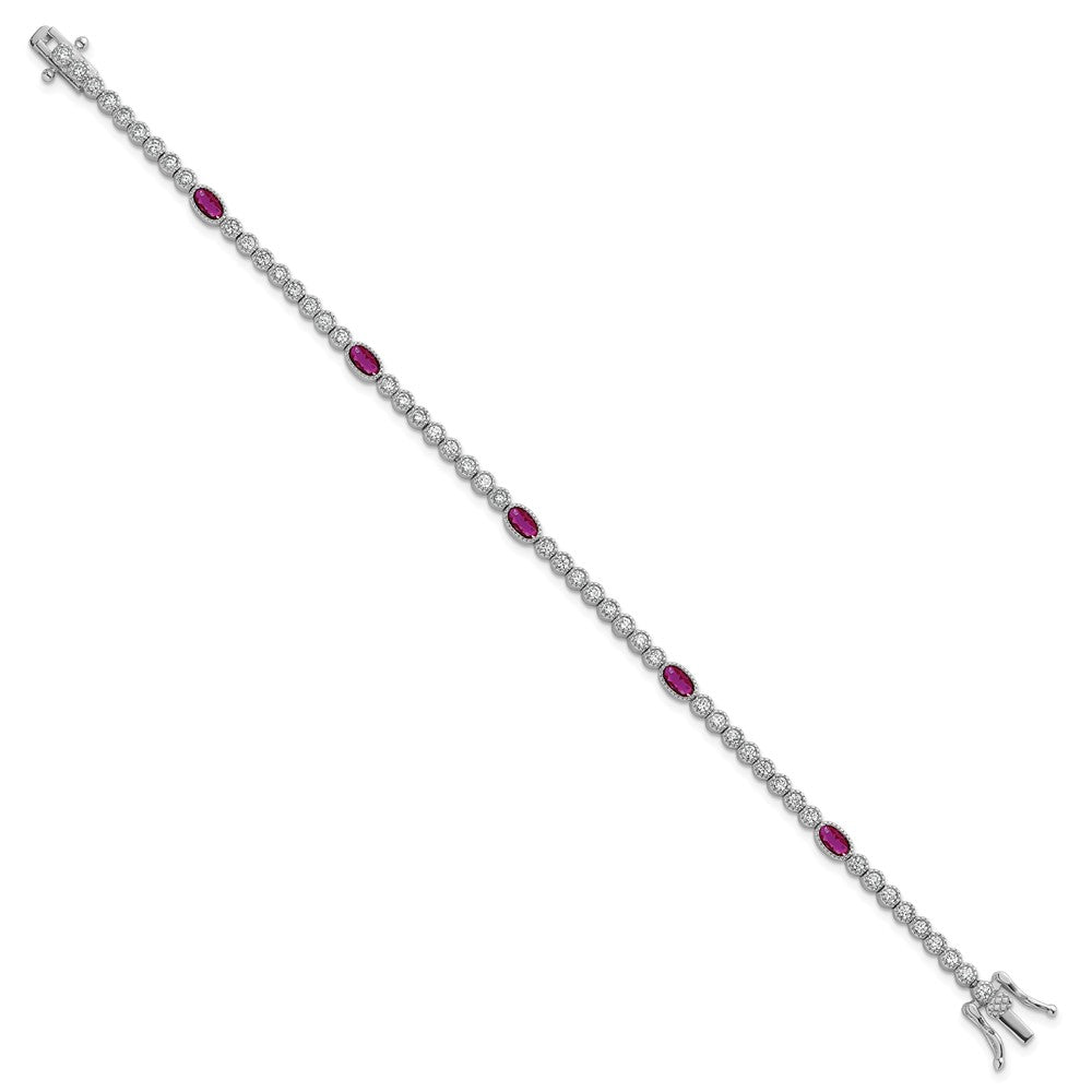 Sterling Silver Rhodium-plated Polished and Beaded Fancy Oval Red and Round White CZ 7 Inch Bracelet