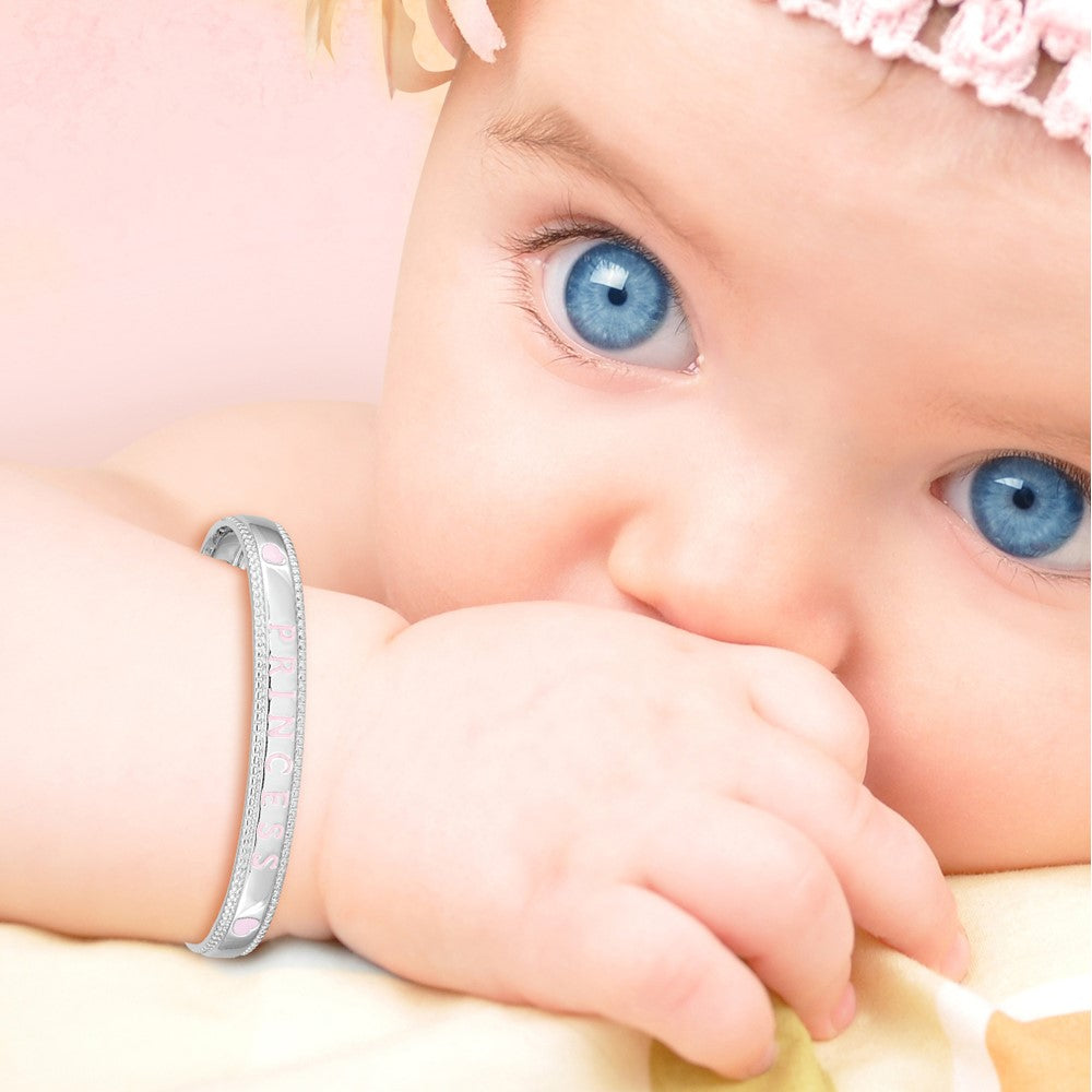 Sterling Silver Rhodium-plated Polished & Beaded Multi-color Enameled Flowers & Hearts PRINCESS with Chain Baby Bangle