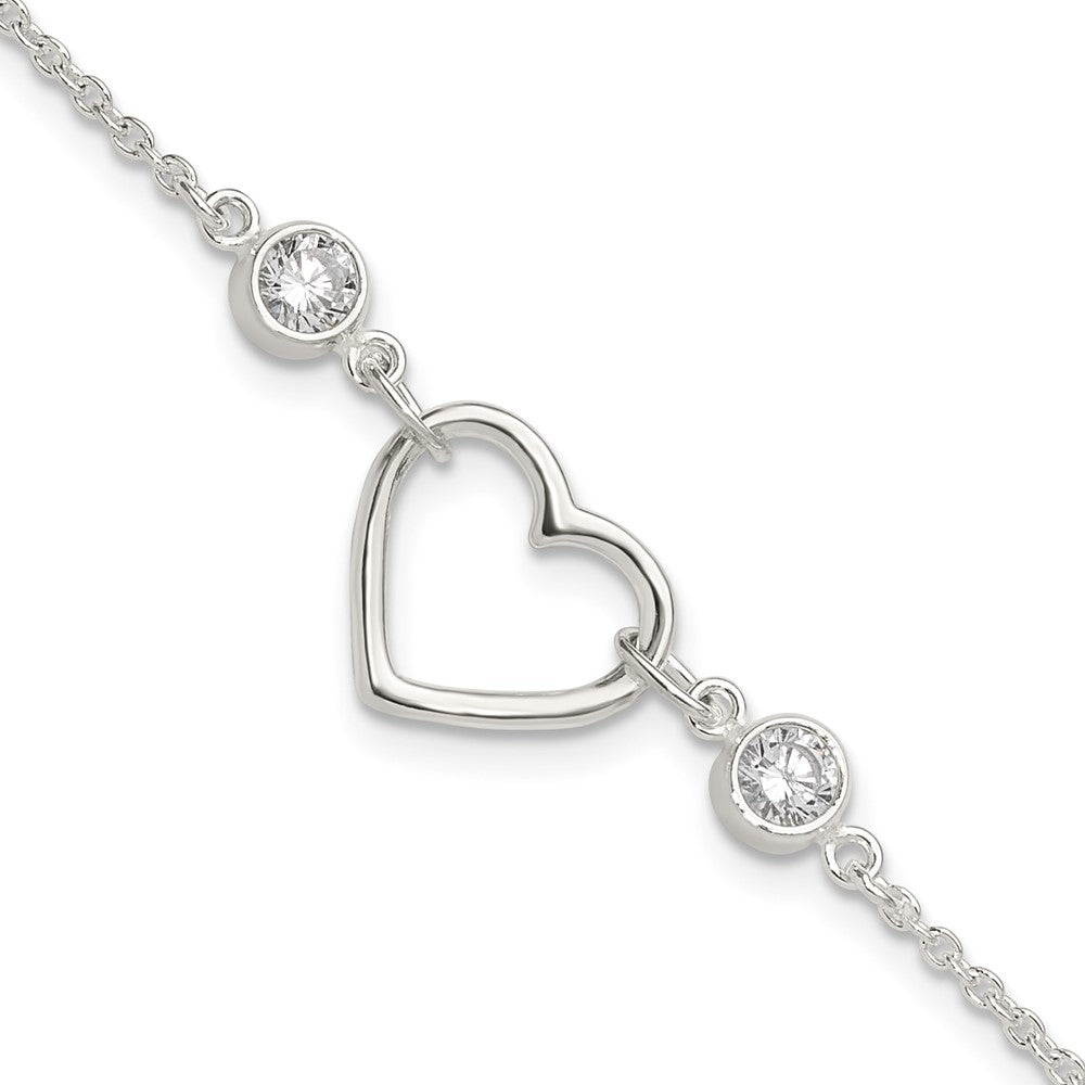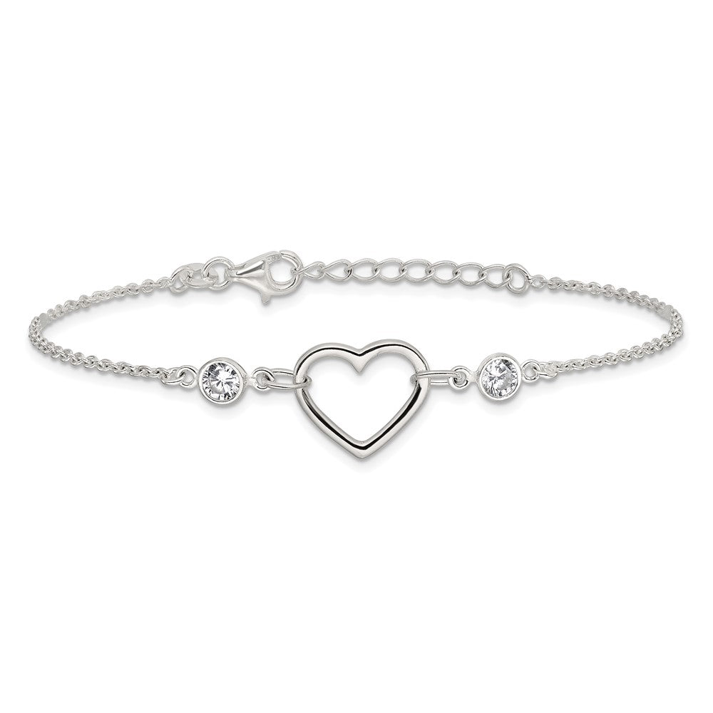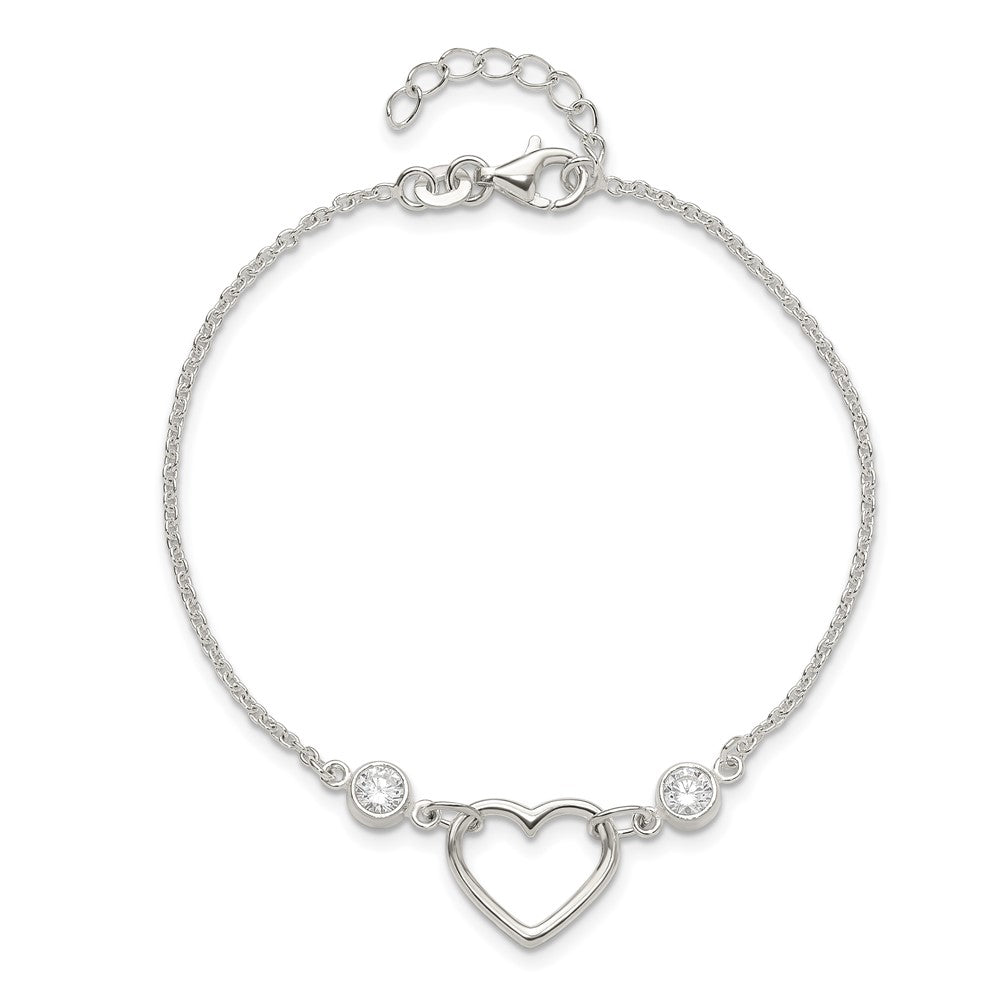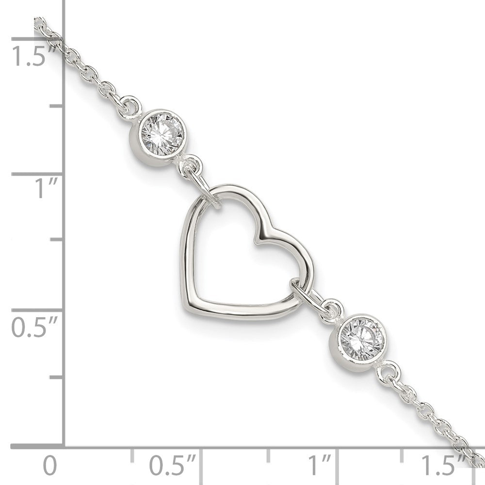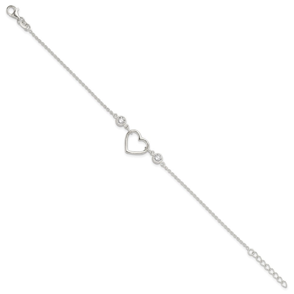 Sterling Silver Rhodium-plated Polished CZ Heart with 1in ext Bracelet