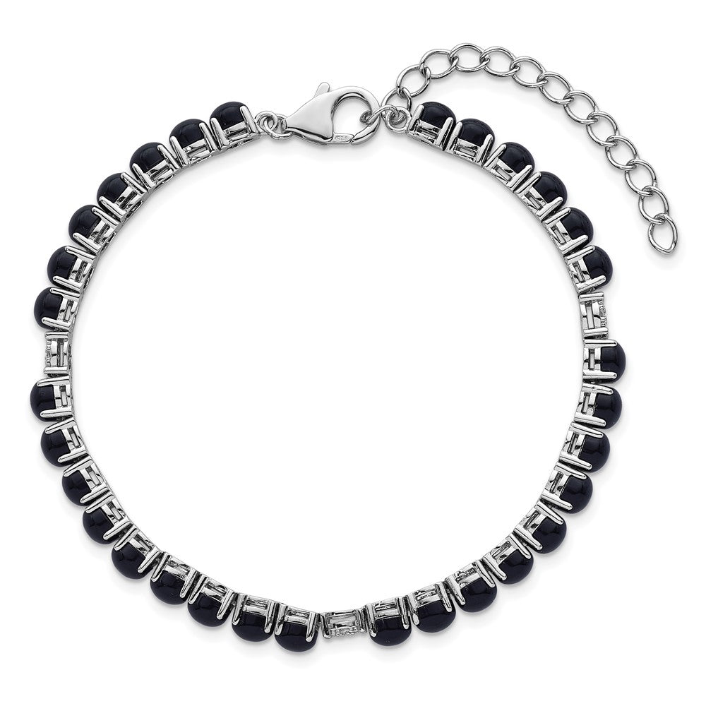 Sterling Silver Rhodium-plated Polished Pave CZ and Onyx 7.5 Inch with 1.5 Inch Extension Bracelet